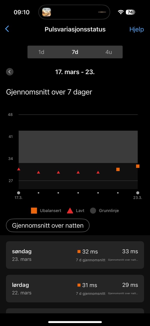 Det er ikke alltid lett å skille. For meg ble det tydelig da jeg begynte å følge med mer systematisk på kroppens signaler. Jeg bruker Garmin-klokken aktivt for å overvåke HRV, BodyBattery, søvn og stressnivå. Det er ikke en fasit, men det gir en pekepinn. Når HRV er lav en hel uke, BB ikke løfter seg, og stressnivåene er høye selv om jeg “hviler”, da vet jeg at det er noe mer enn bare tilfeldige variasjoner.